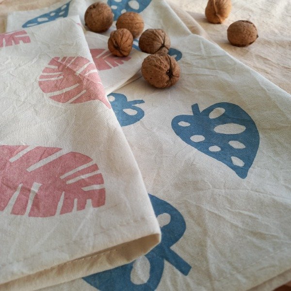 Paño multiuso en lienzo de algodón estampado a mano con sellos.